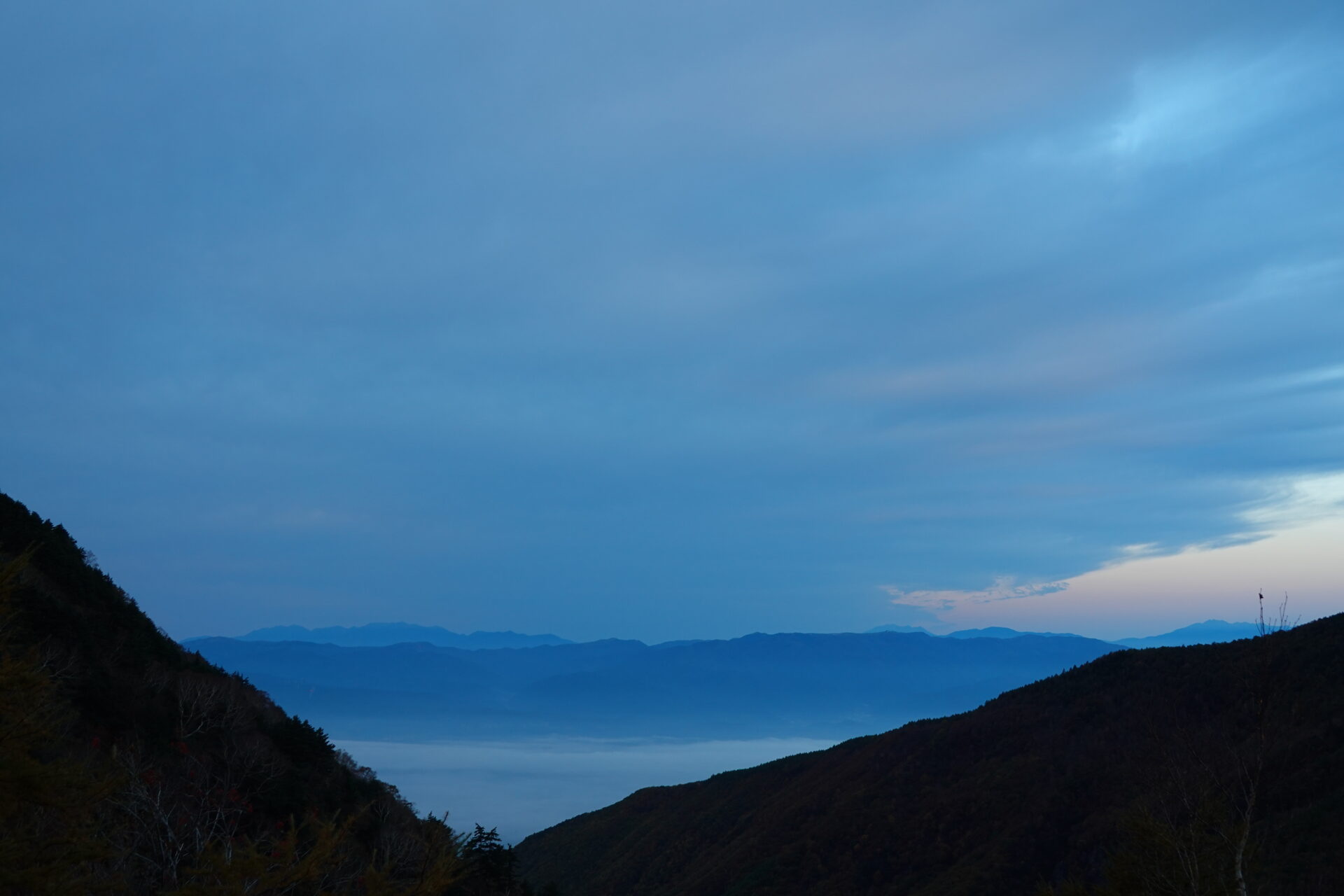 放射冷却で風もなく穏やかな朝の高峰高原で雲海が見られます。