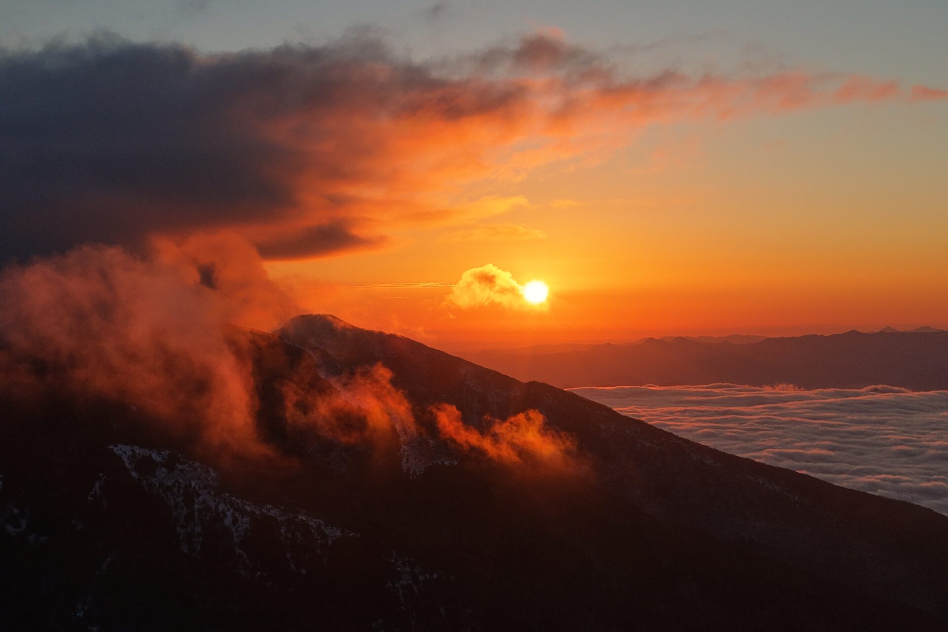流れてゆく雲が赤く染まり幻想的な朝の高峰高原です。