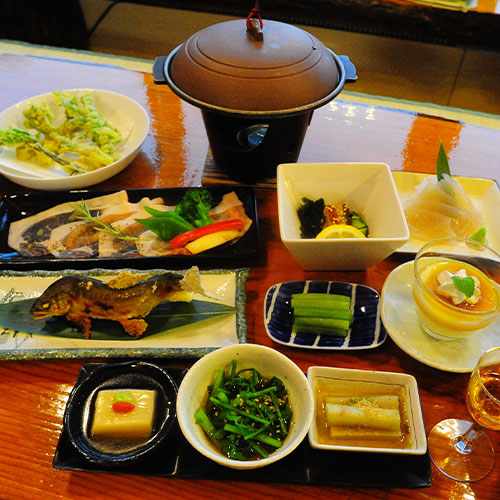 山の幸を、山にいる雰囲気そのままに食事をしていただきたい。そんな思いで造ったメインダイニングの「雲表」は、三方をガラスで囲まれ、室内にいながら自然の中にいるような空間です。