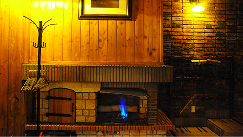 山では自然のさまざまな恩恵を受けています。ロビーにある暖炉は、温泉をくみ上げる時に噴き出る天然ガスを燃料にしています。冬はもちろんですが、夏場も冷える高原です。外で冷えた体を温めてください。