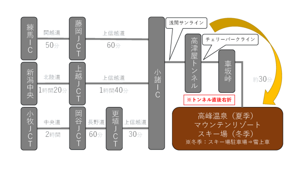 - 東京から 関越道~上信越道⇒高峰温泉 2時間半