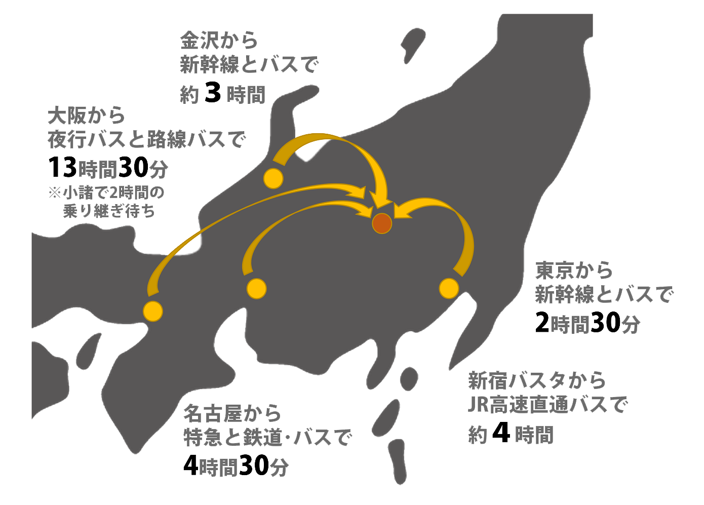 - 新宿から 直通高速バスで 4時間
