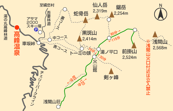 浅間山荘【→120分 80分←】火山館【→20分 15分←】湯ノ平口【→115分 80分←】前掛山【→80分 115分←】湯ノ平口【→15 分 20分←】火山館【→80分 120分←】浅間山荘