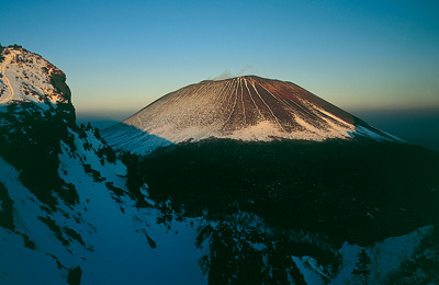 黒斑山スノーシューコース(中コース)は、高峰マウンテンスキー場より赤いテープを目印に中コースと裏コースの分岐約50m先をゆるやかな傾斜を登ること約30分後、後方が開け、湯ノ丸・高峰高原の山々の遠くに北アルプスが連なって見えてくる。ここを登り切ると緩やかな平坦な道に変わる。標高で2,200mすぎる頃には木々の植生が唐松からトウヒやシラビソの針葉樹林へと代わり高山の景色に変わり始める。このような原生林を歩くこと30分、トーミの口に着く、いきなり視界が開けるとガレ場の向こうに雄大な浅間山が現れ、圧巻だ。ここの岩場にはしばしばニホンカモシカが姿を現し、登山客を歓迎してくれる。トーミの頭に続くきつい傾斜で、約10分頑張ると到着だ。ここからは雄姿浅間山はもとより黒斑山が浅間山を包むように外輪山となっているスケールのでかさに言葉を失う。そして、山頂へは緩やかな尾根歩きで約20分で到着。標高2405m黒斑山山頂から見る浅間山が一番絵になる場所だ。山頂は樹氷や霧氷の景色となり、標高の高い山の醍醐味と浅間山の雄姿が冬でも登山者を引きつけてやまない。